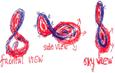 Motion of energetic matter { red electric path, blue magnetic path }.